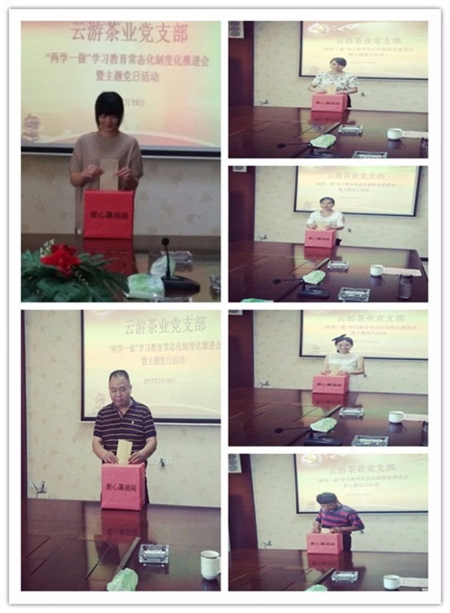2017年7月19日,云游茶業(yè)黨支部召開“兩學(xué)一做”學(xué)習(xí)教育常態(tài)化制度化推進(jìn)會(huì)及主題黨日活動(dòng),向?yàn)?zāi)區(qū)人民愛心募捐作為會(huì)議的一項(xiàng)重要議程進(jìn)行。在公司董事長楊正武、黨支部書記楊應(yīng)輝的指導(dǎo)下,黨員們積極參與、慷慨解囊,共募集愛心款1萬元,全部轉(zhuǎn)賬給長沙市望城區(qū)雷鋒慈善會(huì),用于災(zāi)區(qū)人民災(zāi)后重建工作。